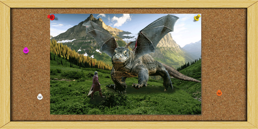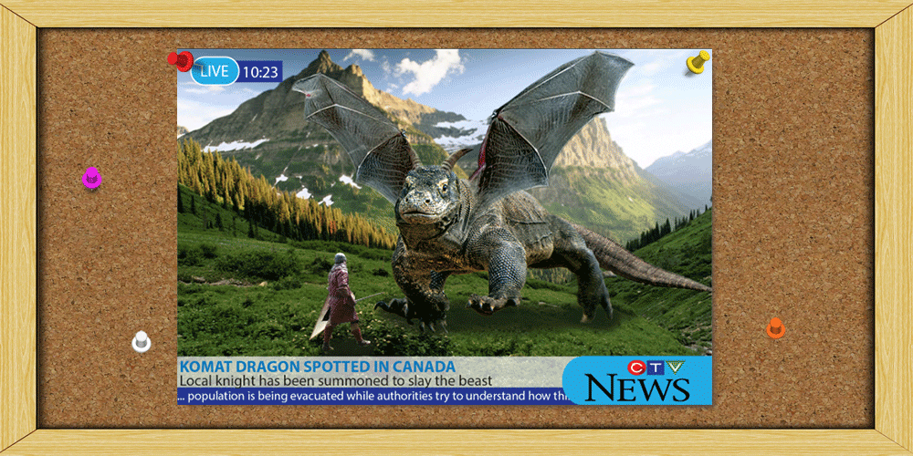 Process: For this project we had to use non-destructive techniques to create our hybrid. I started with a shutterstock image of a Komodo dragon. Then I used the stamp tool to edit a layer above the image to improve how the dragon looked and remove writing from the image. I then proceeded to crop the dragon from the background using masks. After that I added a new background to the image. Next I got an image of a bat, and again edited and cropped the image so that only a wing was visible. I used this process for both wings of the dragon as well as the horns, using an image of a goat. Once I had the dragon I wanted, I changed its colors using a curves layer to make it look darker and a bit green. After this I added a Knight to the image to make it more entertaining. My last step was to create news headlines using Illustrator, to give my image a story.