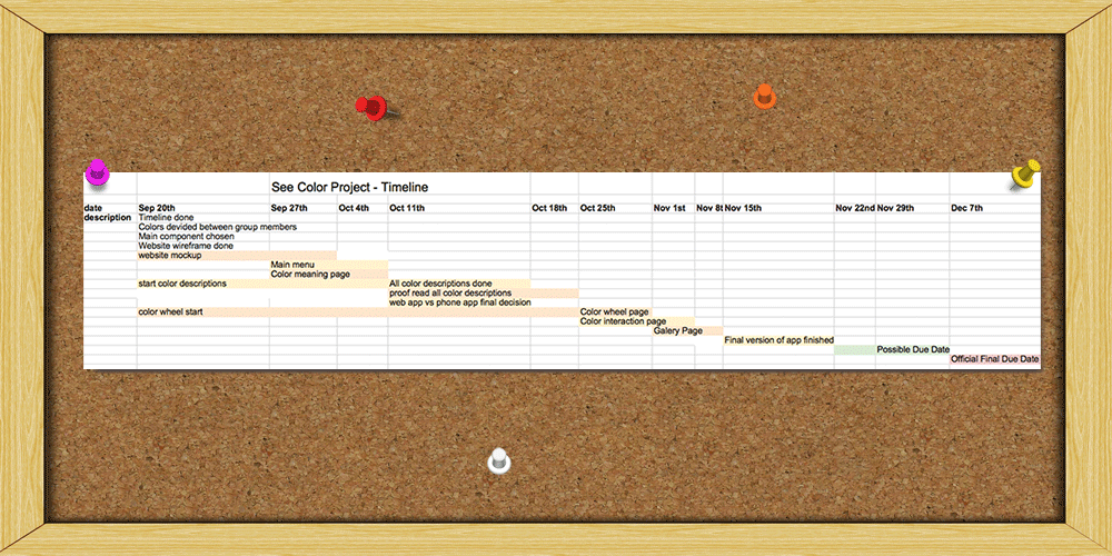Process: We started out with the idea for our app, including what the main and secondary features would be. Our next step was to create a logo and style guide for See Color. The next step was to give team members roles and create a timeline for our project. We then created a user interface workflow and a wireframe. Next we created a mockup for our app, reviewed it and created another version of it. After that we started researching and coding for our app. We ended up with a beta version which we tested for bugs. . We would still like to add to our contrast feature and the download part was not finished at the time due to our lack of knowledge and time. Overall we were satisfied with the end result of our app. Once finished, all groups presented their apps to over one hundred students. Our See Color App won second place out of ten groups.