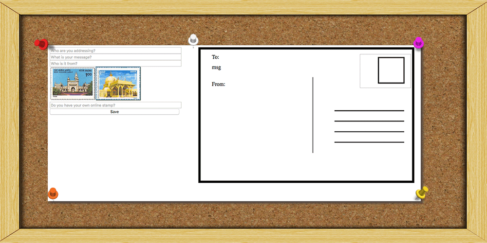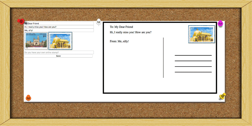 Process: I began with the HTML document, writing out the inputs, images and buttons. I then worked a bit on the CSS to display the postcard image where I wanted it. Finally, I worked on the React JS and made sure that when the user writes on the inputs the message would appear instantly on the postcard. Given the time constraints, I am happy with the results of this project.