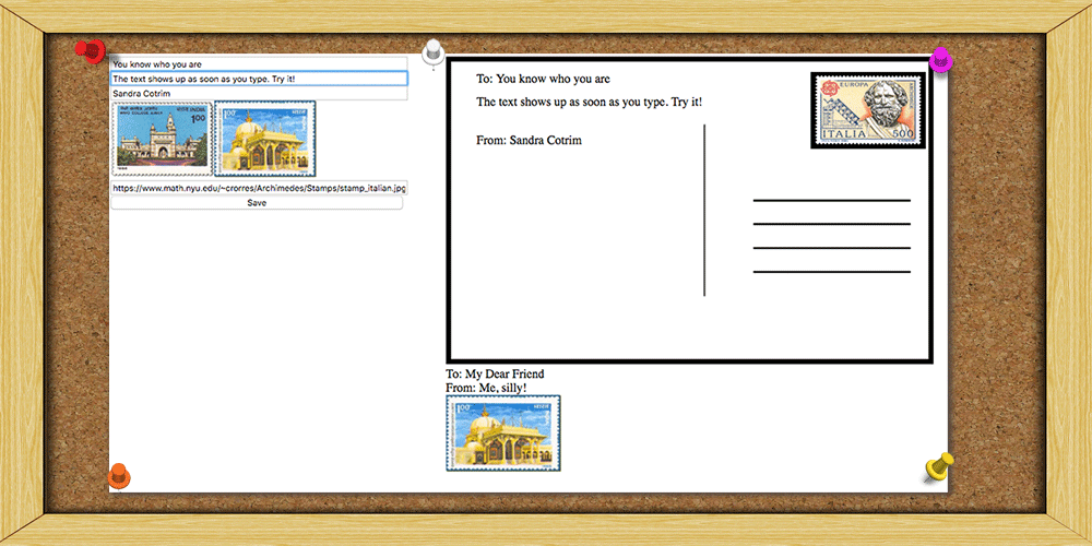 Description: This project was part of an exam at BCIT during my third semestre. I had two hours to create a postcard generator using React JS and Babel JS. The idea was to display a postcard on the page with spaces for users to fill out a few fields including a To, From, and message for the postcard. Users also had to be able to select a stamp for the postcard, either from the available stamps shown or from an image url. Once finished, users could then save their postcard and write another.